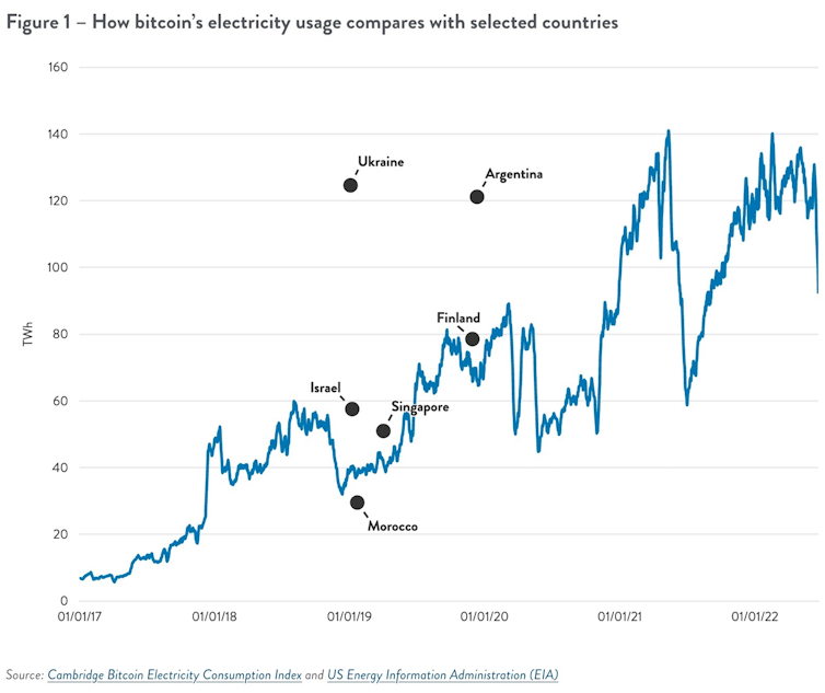 Bitcoin alone consumes around 150 terawatt-hours of electricity each year. Producing that energy emits some 65 million tonnes of carbon dioxide into the atmosphere annually — about the same emissions as Greece.
